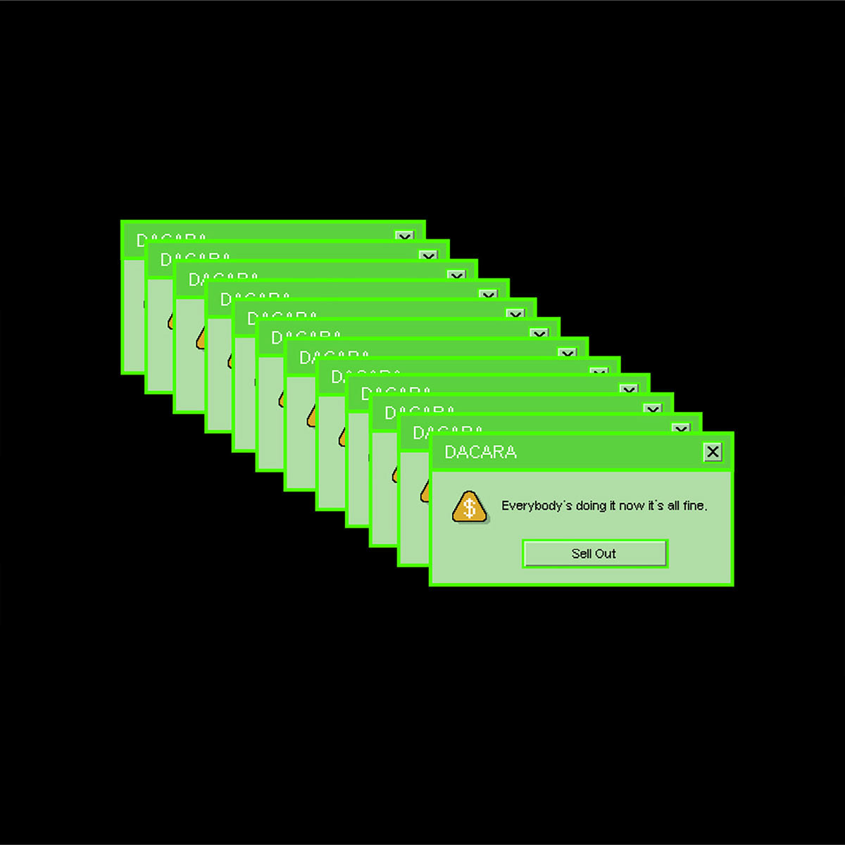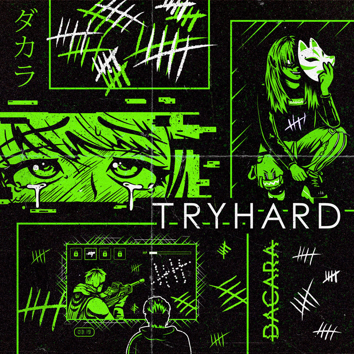 Gig posters and miscellaneous illustrations of the DACARA 'mascots', sticker designs (based on their 'SELLOUT' music video) and supporting illustrations for the single 'TRYHARD'.