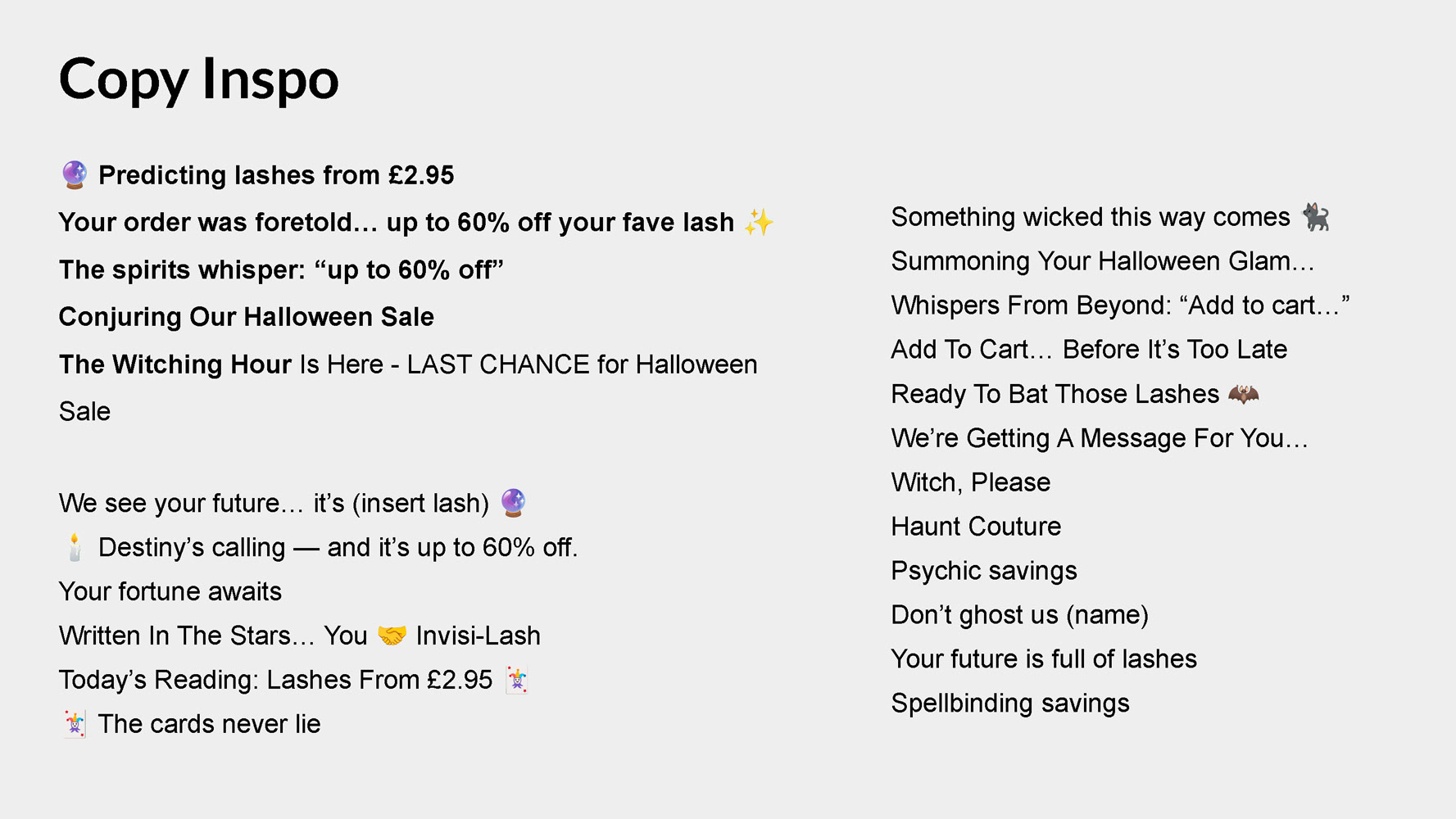 Creative direction for Tatti's Halloween sale campaign including concept, shoot planning & management, set dressing and props. Additionally: image retouching, video editing and campaign rollout for web, email, social and paid social channels.