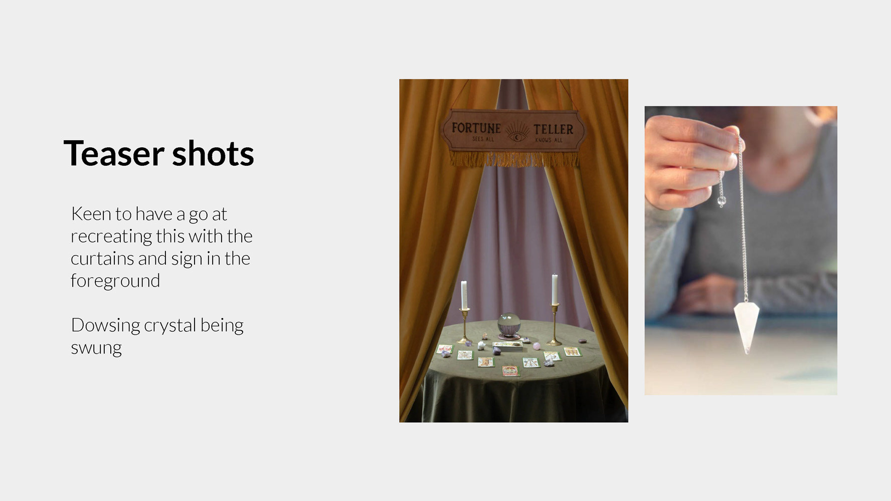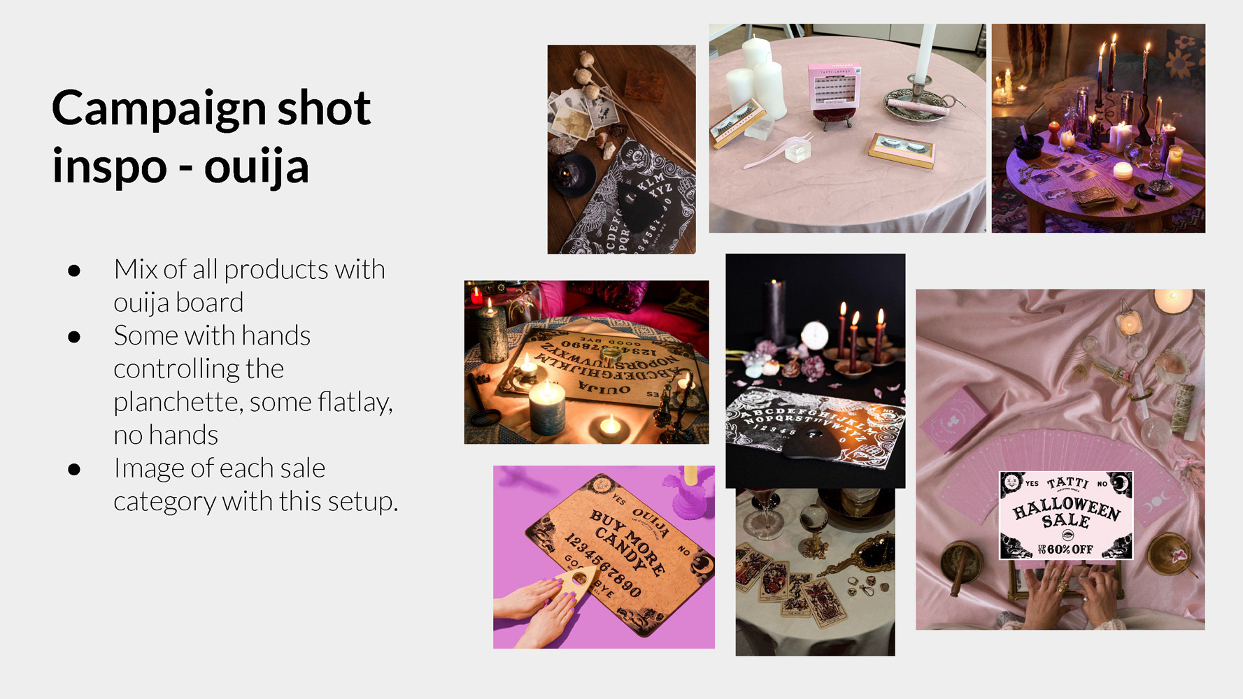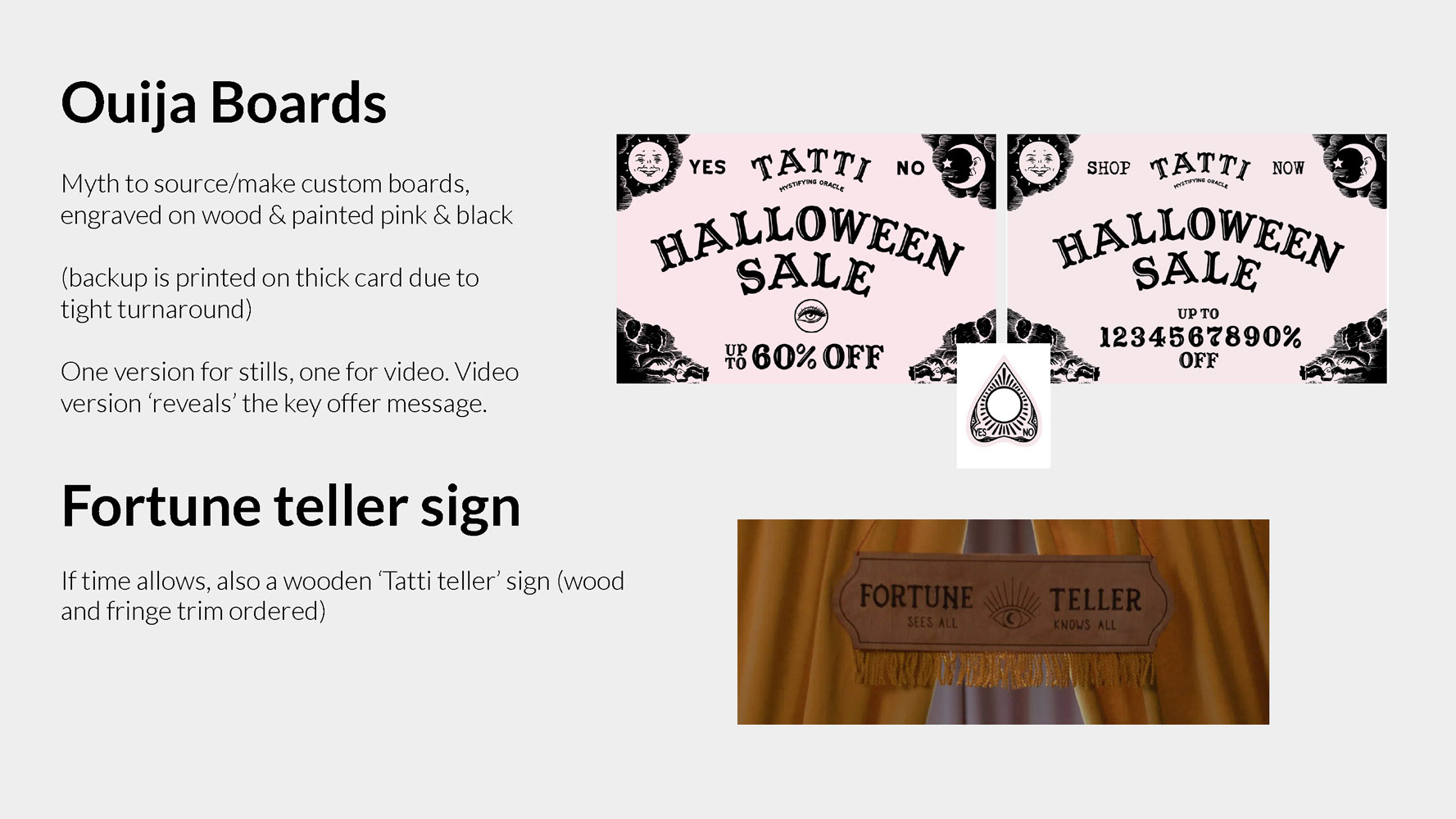 Due to time constraints I designed and made many of the props myself including the etched ouija boards and wooden 'Tatti Teller' sign. We had less than a week to plan this shoot and rolled it out the following week.